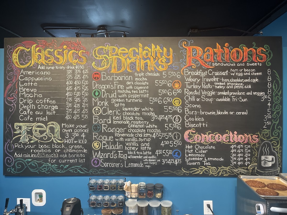 Food options are equally enticing, featuring delightful items like the Breakfast Croissant and Turkey Pesto sandwiches, all priced at just $8.00. Sweets, including scones and biscotti, round out the menu. With creative drink names like Dragon's Fire and Monk, your beverage choice promises a whimsical experience.
