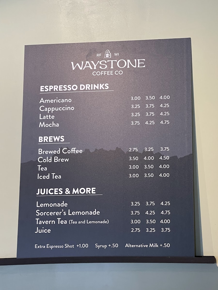 Welcome to Waystone Coffee, your charming local café nestled at 115 E Walnut St, River Falls, WI. Here, exceptional brews meet cozy ambiance, creating a perfect haven for coffee lovers and casual visitors alike. The menu boasts a delightful range of offerings, including brewed coffee, cold brew, and various teas. For those seeking something refreshing, don't miss their unique lemons and specialty drinks like the Sorcerer's Lemonade and Tavern Tea.